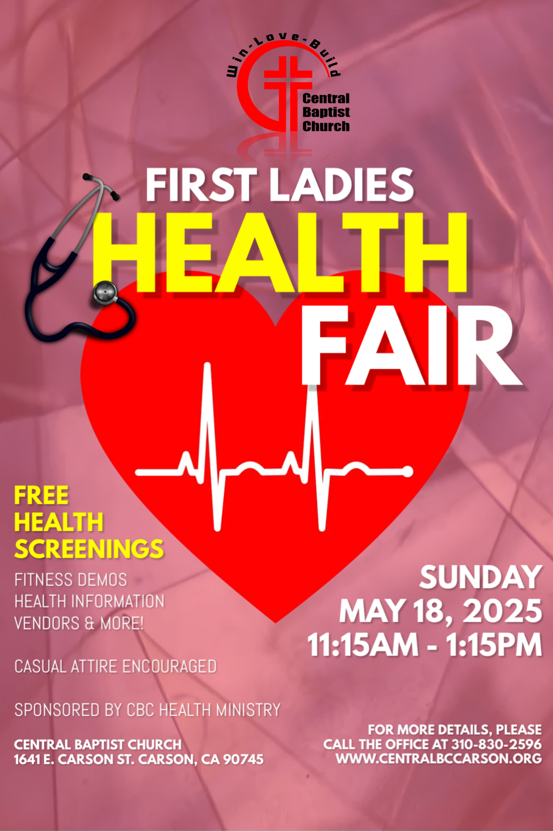 Join us for the First Ladies Health Fair at Central Baptist Church on Sunday, May 18, 2025, from 11:15 AM to 1:15 PM!